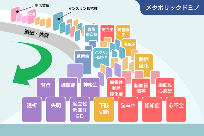 この関係性を示す概念として「メタボリックドミノ」があります。メタボリックドミノとは、生活習慣の乱れや遺伝的要因から始まり、肥満、インスリン抵抗性、高血圧、糖尿病といった代謝異常が次々と連鎖し、最終的には心筋梗塞や脳卒中などの重篤な疾患へと進行していく様子を、ドミノ倒しに例えたものです。